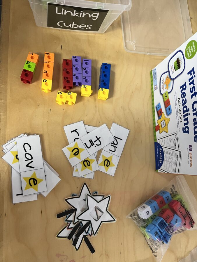 - Prepare the following materials: star magnifying glass print-outs, letter blocks (I used linking cubes and Sharpie), and magic e word cards. See the image above.